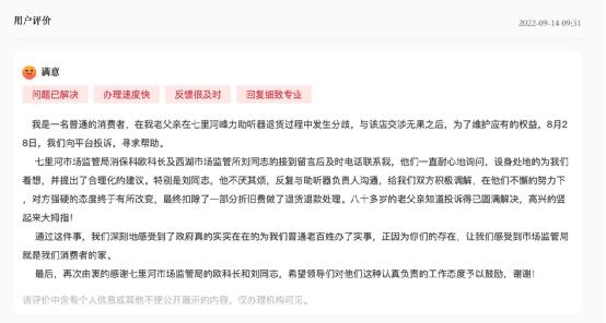 “通过这件事,我们深刻地感受到政府实实在在地为普通老百姓办实事,正因为你们的存在,让我们感受到市场监管局就是我们消费者的家。”事件圆满解决后,王女士留言表达了感激之情。