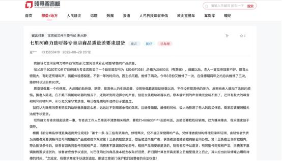“我父亲于2020年10月17日在峰力专卖店购买了一个助听器,型号为2040F358,价格为20680元。佩戴以后,老人一直觉得效果不好,噪音特别大,有时还有啸叫声,佩戴体验感极差。在2年保修期内总共维修了3次,维修时长达约有80天。”日前,甘肃省兰州市的王女士在人民网“领导留言板”上反映自己的父亲购买助听器后遇到了质量问题,维修频繁且耗时长,极大地影响了老人的日常生活。