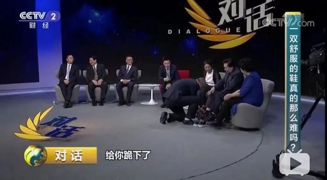 2019年,在央视《对话》节目上,当着全国观众的面,足力健创始人张京康拎着鞋走上台,咔嚓一声就跪下了,边给嘉宾换鞋,边用手摸着其足弓。