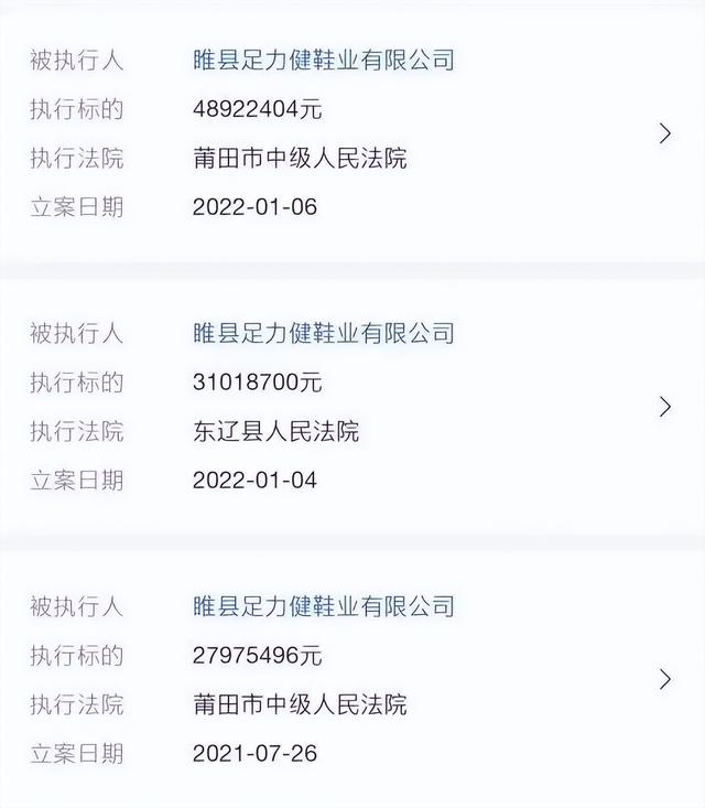 紧接着,1月6日,雎县足力健鞋业有限公司新增被执行人信息,执行法院为莆田市中级人民法院,执行标的4892.24万元。
