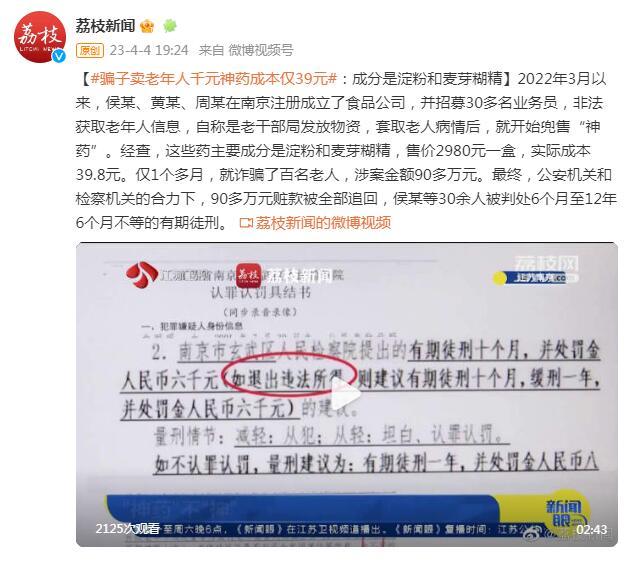 2022年3月以来,侯某、黄某、周某在南京注册成立了食品公司,并招募30多名业务员,非法获取老年人信息,自称是老干部局发放物资,套取老人病情后,就开始兜售“神药”。经查,这些药主要成分是淀粉和麦芽糊精,售价2980元一盒,实际成本39.8元。仅1个多月,就诈骗了百名老人,涉案金额90多万元。最终,公安机关和检察机关的合力下,90多万元赃款被全部追回,侯某等30余人被判处6个月至12年6个月不等的有期徒刑。