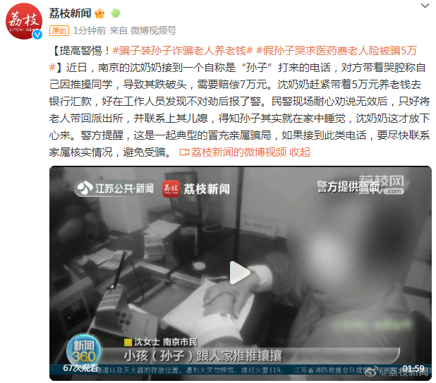 近日,南京的沈奶奶接到一个自称是“孙子”打来的电话,对方带着哭腔称自己因推搡同学,导致其跌破头,需要赔偿7万元。沈奶奶赶紧带着5万元养老钱去银行汇款,好在工作人员发现不对劲后报了警。民警现场耐心劝说无效后,只好将老人带回派出所,并联系上其儿媳,得知孙子其实就在家中睡觉,沈奶奶这才放下心来。警方提醒,这是一起典型的冒充亲属骗局,如果接到此类电话,要尽快联系家属核实情况,避免受骗。