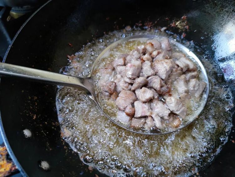 ③.炒制精瘦肉时记得低温滑炒,也就是油温在三成热左右时把肉入锅,滑炒至变色即可,这样可以有效地防止把肉炒老。