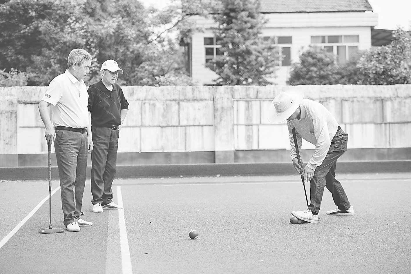 ①日前,在鼎城区灌溪镇富贵坪村幸福屋操场,老人们打门球。