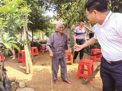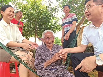 上午10时30分,记者和陈诚汉走进水尾村,躺在门前网床上的103岁老党员陈凤莲赶紧从网床上直起身子,灿烂的阳光从叶缝间洒在她古铜色的脸庞上。