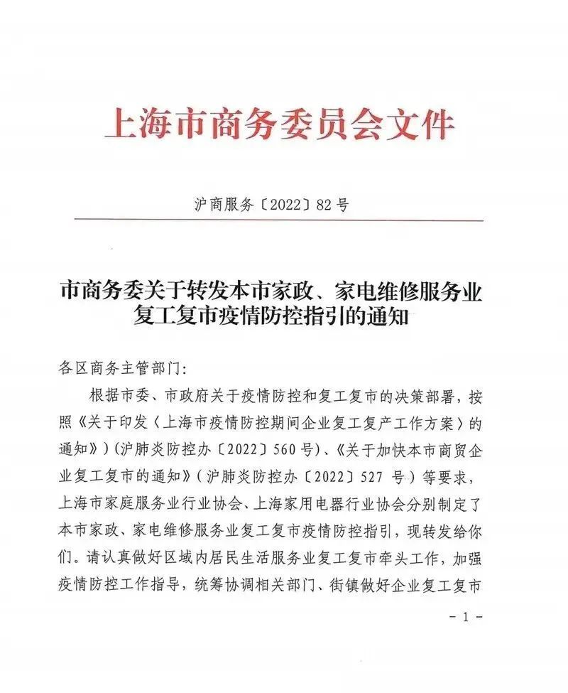 近期,上海市家庭服务业行业协会、上海家用电器行业协会分别制定了本市家政、家电维修服务业复工复市疫情防控指引,上海市商务委已经将指引转发给各区商务主管部门。