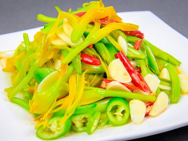 在焯好水的黄花菜中倒入蒜片的浇汁,放入青线椒和小米椒一起搅拌均匀以后即可装盘食用。