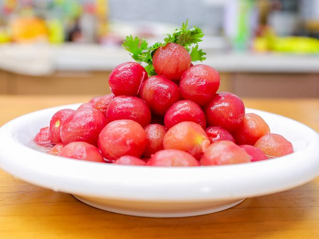 烧半锅开水,把小番茄倒进去汆煮30秒钟即可捞出,放入凉水中过凉,去除小番茄上的皮。