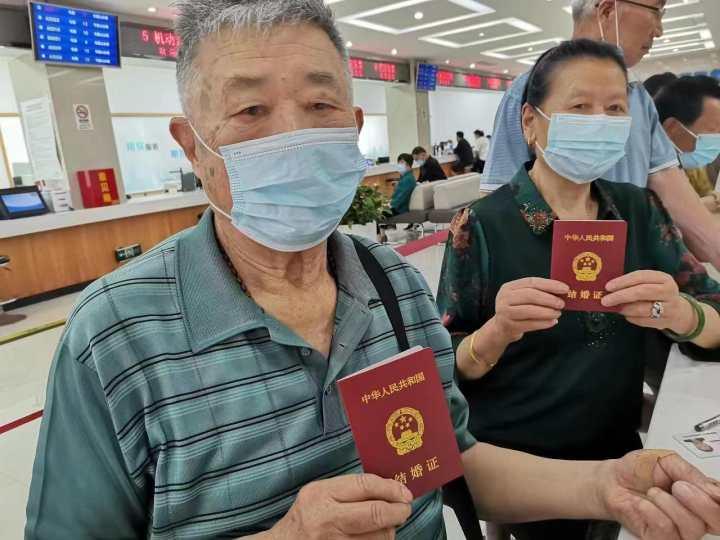 日前,杭州丁兰街道公共服务中心门口人头攒动,只见老人们两个一对,开心地手搀着手,拿着刚补领完的结婚证,在志愿者的引导陪同下离开。