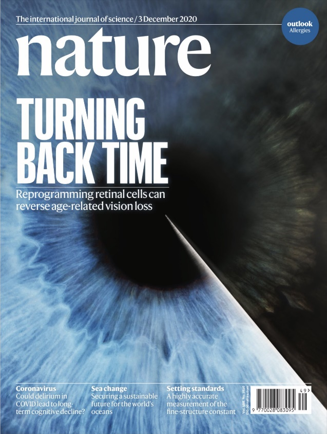 辛克莱团队利用能够将成年细胞变成干细胞的分子物质,将小鼠体内的衰老细胞重置为“年轻版本”,使得视力不佳和视网膜受损的老年小鼠突然恢复视力,甚至可以与它们的后代相媲美[1]。相关成果发表于顶级学术期刊Nature,并荣登封面。