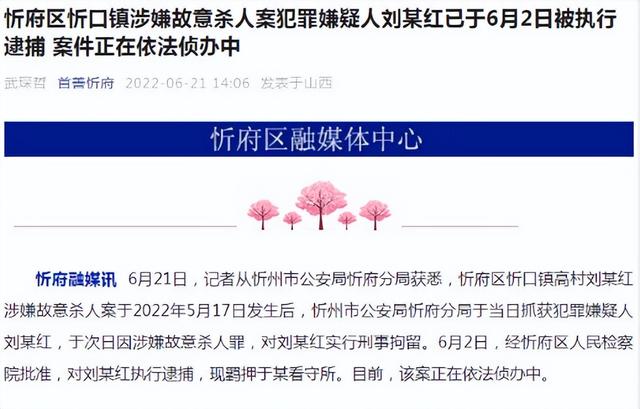 6月21日,记者从山西省忻州市公安局忻府分局获悉,忻府区忻口镇高村刘某红涉嫌故意杀人案于2022年5月17日发生后,忻州市公安局忻府分局于当日抓获犯罪嫌疑人刘某红,于次日因涉嫌故意杀人罪,对刘某红实行刑事拘留。