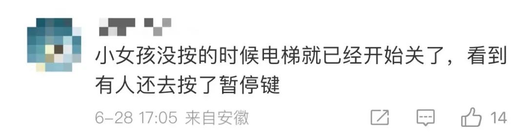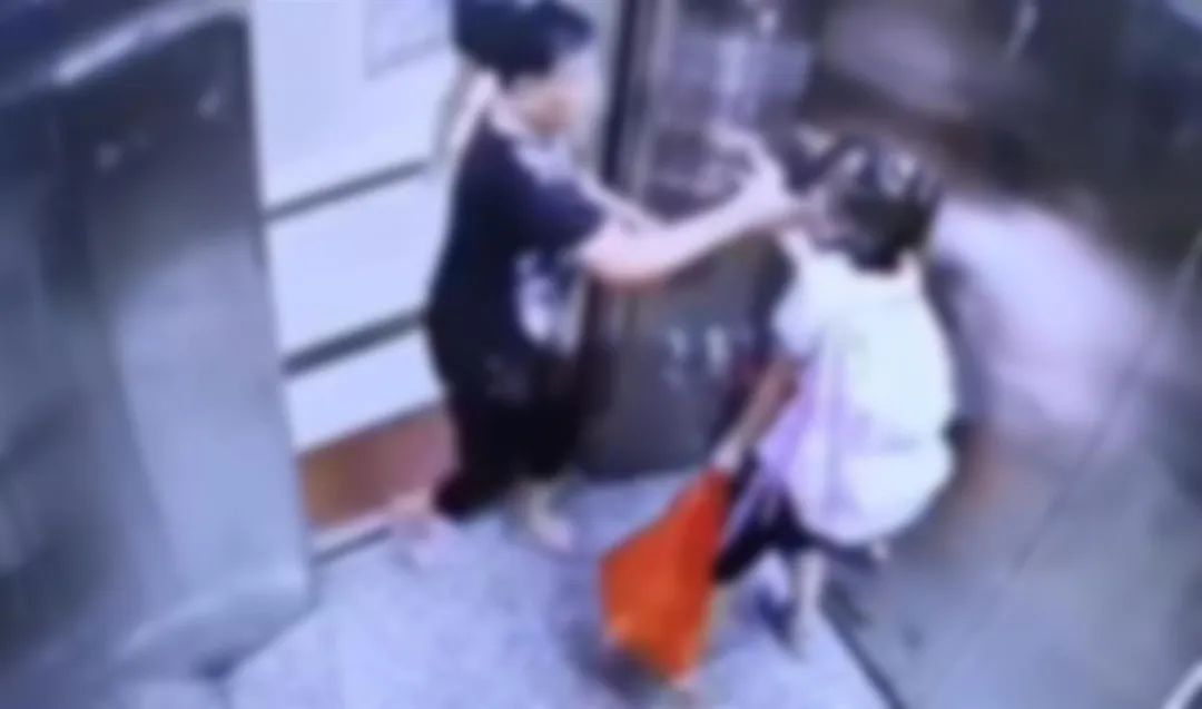 一段现场视频显示,电梯停在某一楼层后,两人开门走出。一个拎着塑料袋、背着书包的小女孩进了电梯,并按了楼层键,电梯门迅速合上。