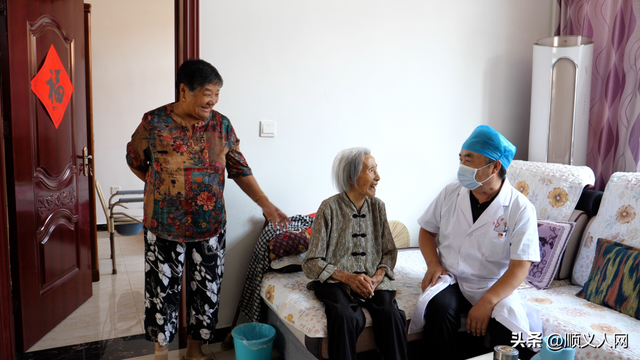 医务人员上门询问了解101岁王淑敏老人接种疫苗后的身体状况。