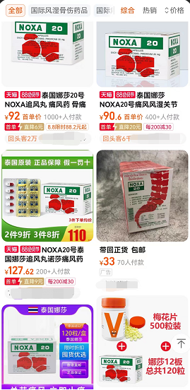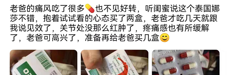 记者搜索了几家电商平台发现,这款药物都有在销售,有的店铺月销量已上千件。商家在介绍中号称:这款药物有治疗痛风、风湿等功效。