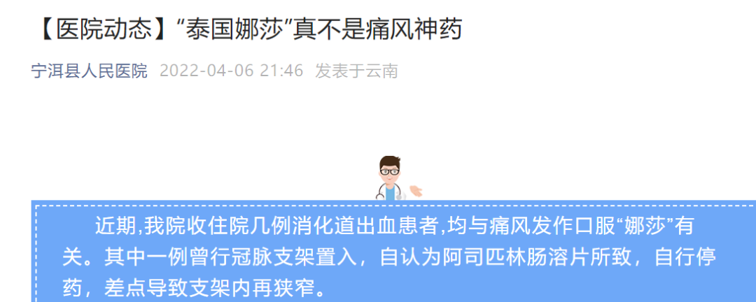 记者查询发现,此前早有医疗机构和医师发文做过提醒:“娜莎”真不是痛风神药,它的副作用很多!今年4月,云南宁洱县人民医院收治了几例消化道出血患者,均与痛风发作口服“娜莎”有关……