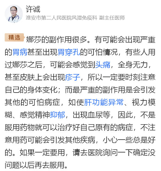 还有医师提醒,除了可能会出现严重的胃病甚至出现胃穿孔的可怕情况外,有些人用过“娜莎”之后,还会感觉到头痛,全身无力,甚至皮肤上会出现疹子,所以一定要时刻注意自己的身体变化;而最严重的副作用是会引发其他的可怕病症,如使肝功能异常、视力模糊、感觉精神抑郁,出现血尿等。