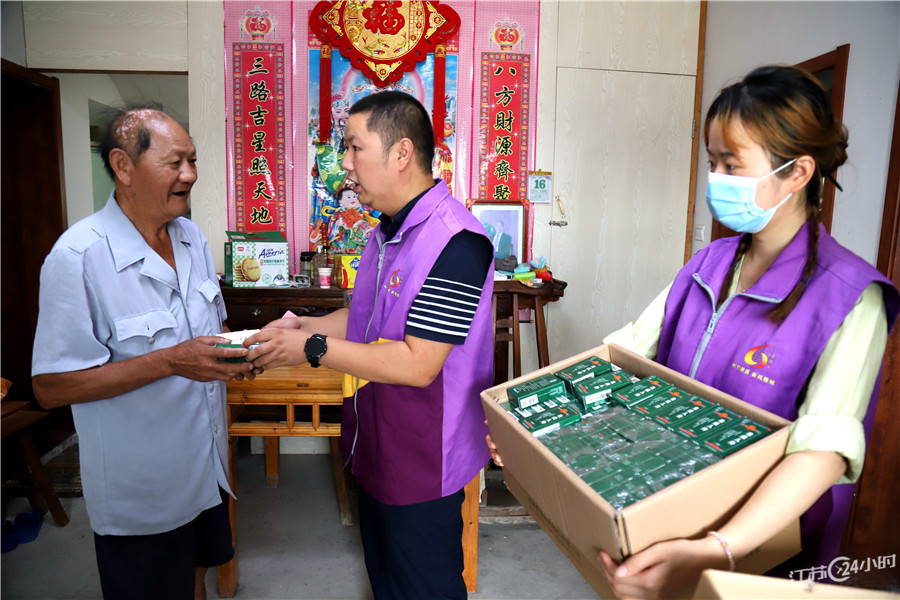 8月17日,南京市高淳区桠溪街道穆家庄村新时代文明实践站组织志愿者,走村入户为全村153名80岁以上低保和五保老人发放防暑降温物品,送上夏日关怀。