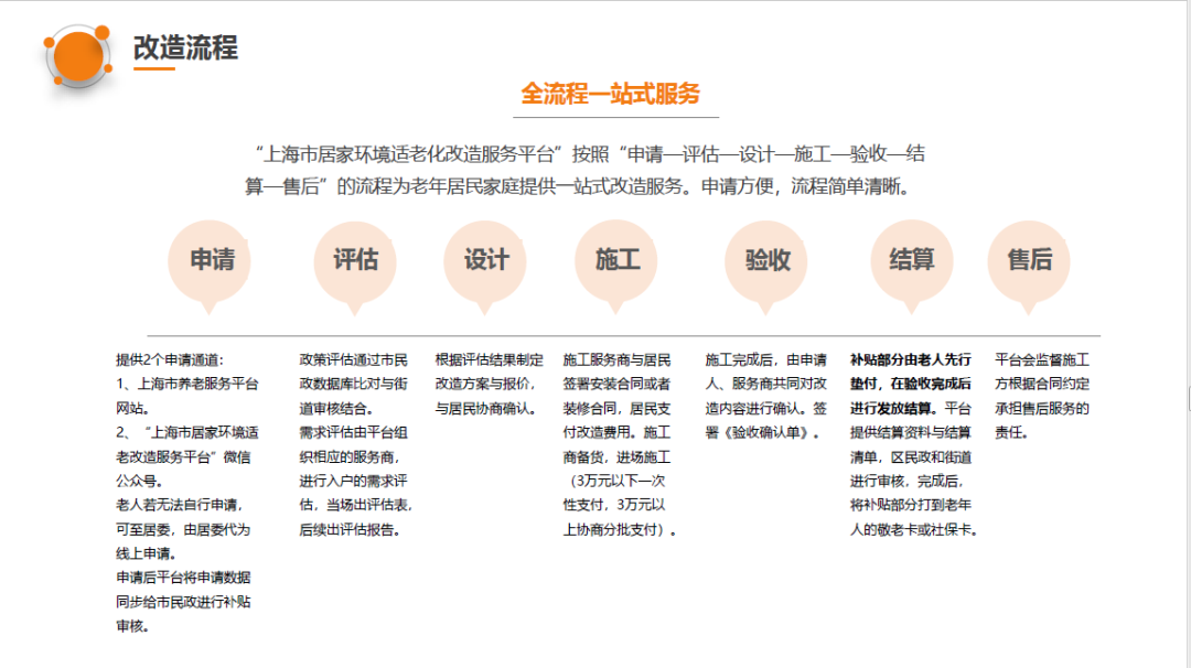 直到2020年,适老化改造才启动了市场化运作之路。按照玄关、卫生间、厨房、客厅、卧室、阳台、过道七大生活场景进行分类,多达60余项产品与服务,老年人可以根据自己的需求进行组合搭配,政府给予一定比例的改造补贴。