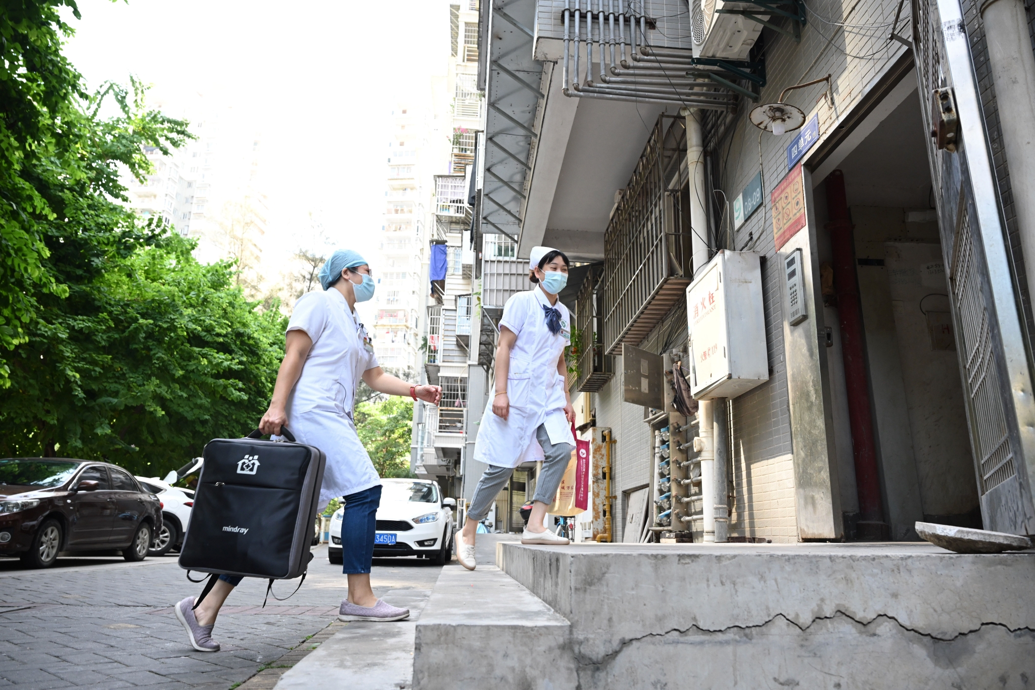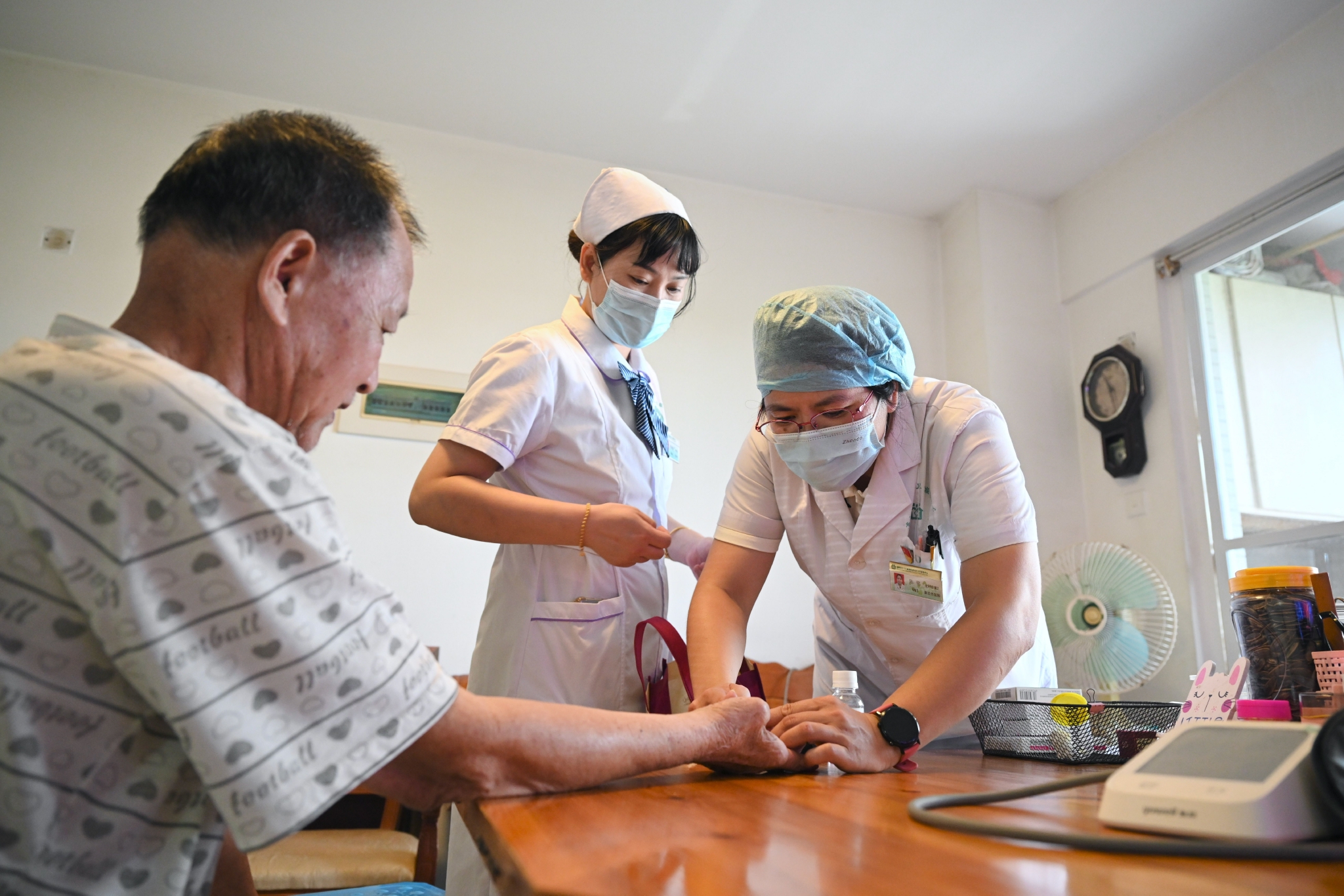 10月9日,福州市台江区瀛洲社区卫生服务中心的家庭医生陈铭(右)、主管护师李凌弦(中)在签约居民家中为老人检查身体。新华社记者 姜克红 摄