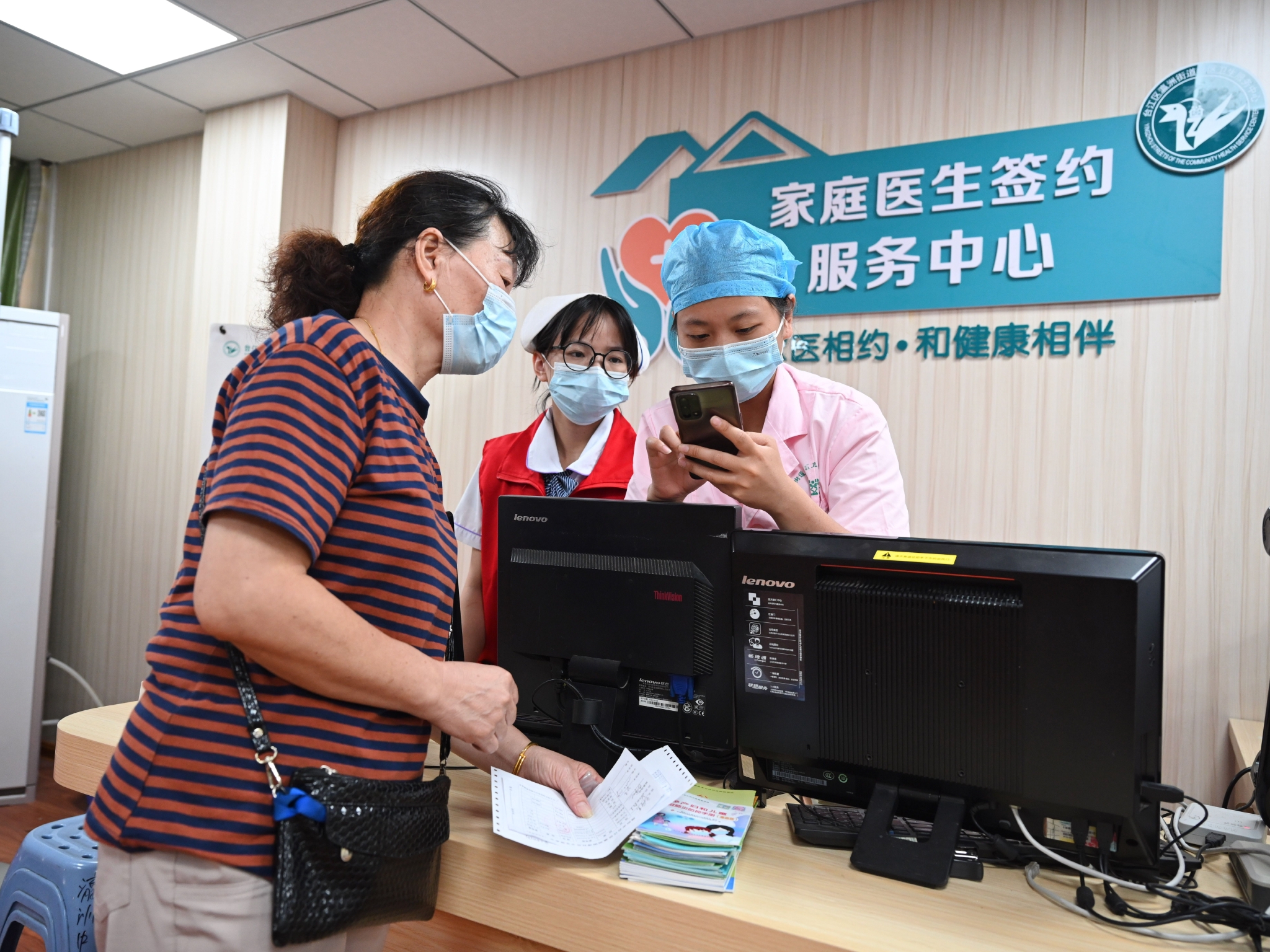 10月9日,在福州市台江区瀛洲社区卫生服务中心,工作人员为居民线上办理家庭医生签约服务。新华社记者 姜克红 摄
