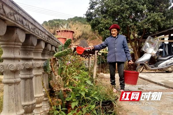 周玉兰老人在给花浇水。