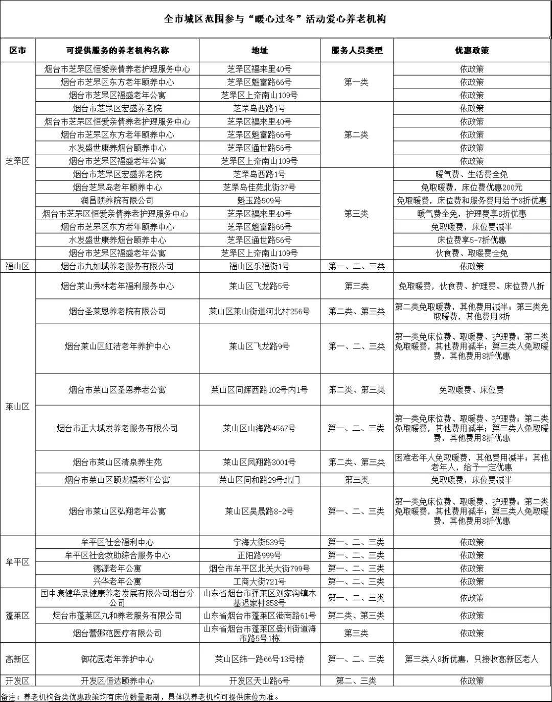 此次“暖心过冬”活动服务人群分为三类:第一类“优先服务人群”为具有烟台市户籍且居住在辖区内分散供养特困老年人,该类服务人群入住养老机构,费用全免。第二类“延伸服务人群”为具有烟台市户籍的高龄、失能、空巢、留守、残疾、计划生育特殊家庭老年人以及经济困难老年人,在活动期内入住养老机构,免取暖费,其他费用减半。第三类“其他服务人群”为其他确有生活困难的年满60周岁以上老年人,在活动期内,入住养老机构免取暖费,其他费用给予一定优惠。据统计,目前全市33家养老机构参与此次“暖心过冬”爱心公益活动,有需求的老人可联系预约。