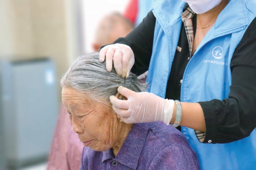 台州市路桥区路北街道升谷寺村党员志愿者为老年人梳洗、掏耳朵。