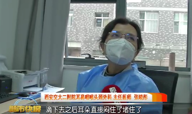 西安交大二附院耳鼻咽喉头颈外科主任医师张晓彤:“患者在外面药店买的滴耳油,拿上就直接滴在耳朵里了,滴下去之后,耳朵直接闷住了,也堵住了,什么也听不见,患者十分着急了。”