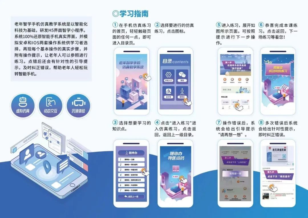目前,系统适配了手机端与平板端,包含“智能手机随心学”“老年智能生活”两大版块,内容涵盖“手机入门”“微信”“支付宝”“随申办”四大模块18项内容的智能手机常用功能学习内容。老年人可以在系统提供的沉浸课程中进行仿真练习,将“学”与“习”二者统一起来构成完整的学习过程。