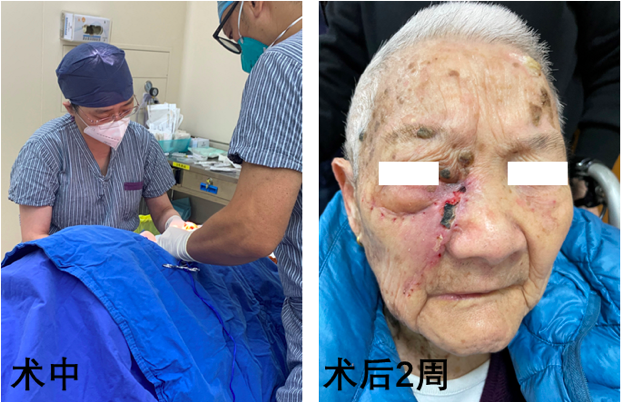 10月24日,老人在局麻下接受了右面部黑色素瘤姑息性切除术,术中切除皮损约6.0cm*3.0cm,切缘0.5-1.0cm,深达SMAS层。