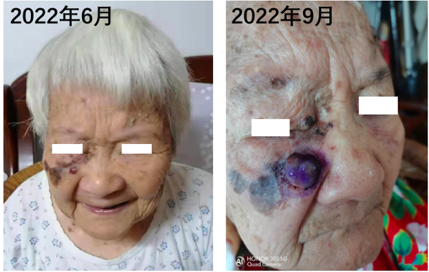 家住上海浦东的沈奶奶101岁高龄,是远近闻名的“长寿之星”。不过,今年6月左右,老人开心不起来了,老人家右侧面颊出现一块黑斑,靠近鼻翼边缘还有一粒赤豆大小的棕黑色“肉疙瘩”,随后短短3个月里,肉疙瘩从赤豆大小迅速长到乒乓球大小,而且轻轻一碰就破溃出血……子女预感不妙,慕名找到华山医院皮肤外科的知名专家栾菁。