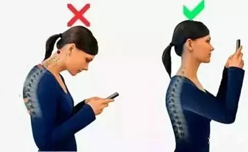 看手机时,高抬手持手机,手机屏幕中心与眼睛在同一高度,使头部保持垂直位。