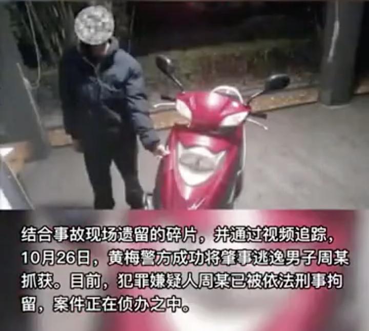 25日凌晨,受害人洪某因伤势过重抢救无效死亡。结合事故现场遗留的碎片,并通过视频追踪,黄梅警方成功将肇事逃逸男子周某抓获。目前,犯罪嫌疑人周某已被依法刑事拘留,案件正在侦办中。