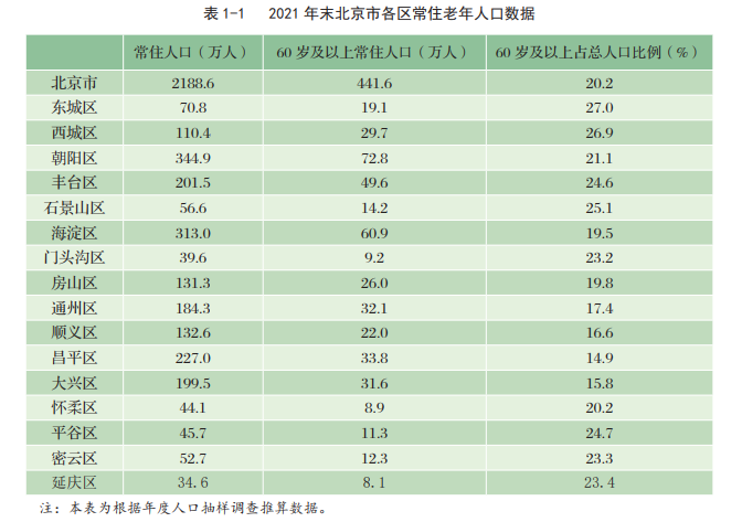 根据此前“2022智慧康养高峰论坛”上,北京市老龄办、市老龄协会发布的《北京市老龄事业发展报告(2021)》显示,截至2021年底,北京市60岁及以上常住人口441.6万人,占常住总人口的20.18%。65岁及以上常住人口311.6万人,占常住总人口的14.24%,比2020年增加20.4万人。根据报告,2021年是北京市近五年常住老年人口增量最多、增长幅度最大的一年。