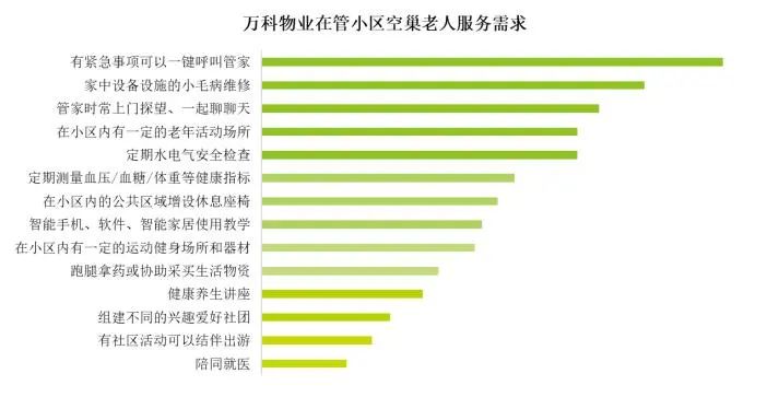 《空巢老人物业服务指南》指出,空巢老人居家养老过程中存在的摔倒、居住生活不便、缺少陪伴等难题,居住环境安全、陪伴、社交方面成为物业服务的主要发力点。其中,有紧急事项可以一键呼叫管家这一需求最为迫切,占比64.4%;其次家中设备设施的小毛病维修、管家时常上门探望/聊天、在小区内有一定的老年活动场所、定期水电气安全检查等服务也有强烈需求。
