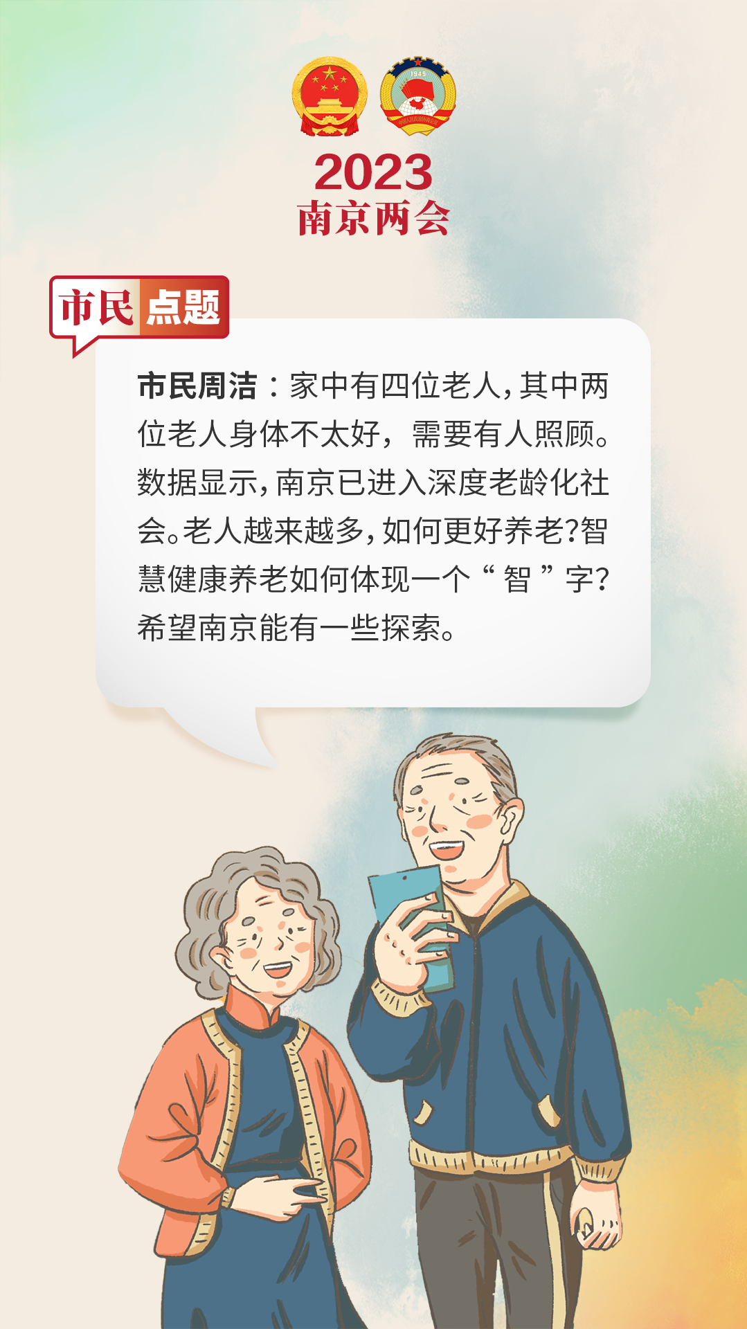 市民周洁:家中有四位老人,其中两位老人身体不太好,需要有人照顾。数据显示,南京已进入深度老龄化社会。老人越来越多,如何更好养老?智慧健康养老如何体现一个“智”字?希望南京能有一些探索。