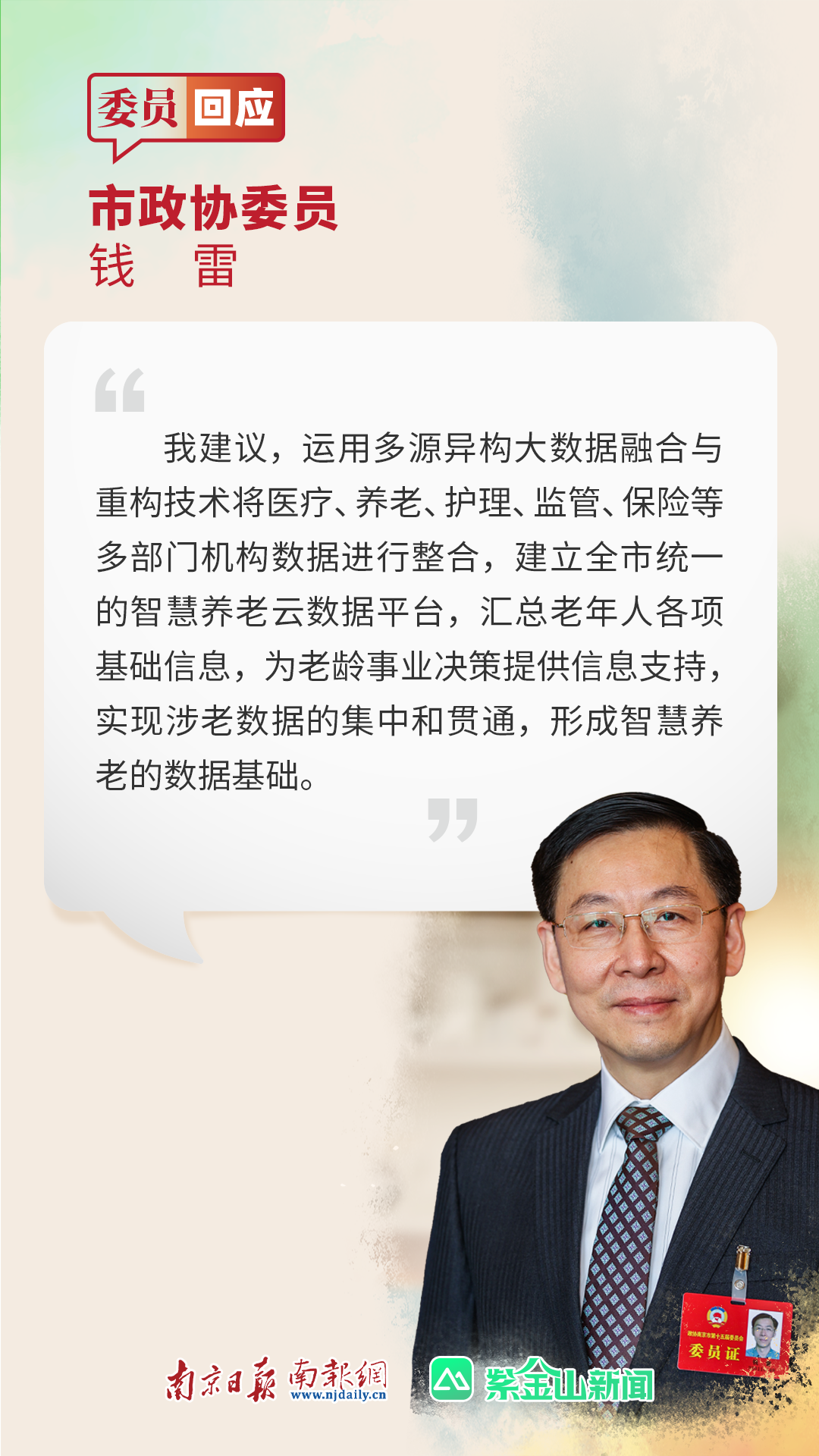 我建议,加强南京市智慧养老服务体系顶层设计,制定《南京市老年照护统一需求评估及服务管理办法》,完善智慧养老的行业标准、政策制定及其配套法律法规,为智慧养老产业提供健康的环境。同时,加快智慧养老服务人才队伍建设,通过包括提供就业机会、升迁机会以及落户加分多方面举措吸引人才,形成一支规范的智慧养老服务人才队伍。运用多源异构大数据融合与重构技术将医疗、养老、护理、监管、保险等多部门机构数据进行整合,建立全市统一的智慧养老云数据平台,汇总老年人各项基础信息,为老龄事业决策提供信息支持,实现涉老数据的集中和贯通,形成智慧养老的数据基础。