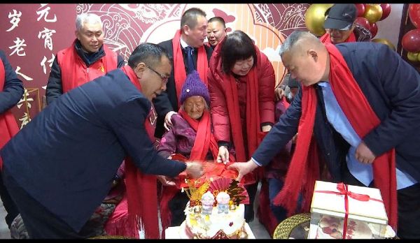 在中国传统的元宵佳节上午这天,安徽省亳州市利辛县巩店镇把辖区内的三名百岁老人邀请到镇政府食堂,为他们祝寿,向老人送上红围巾、蛋糕和慰问金,祝福他们健康长寿。