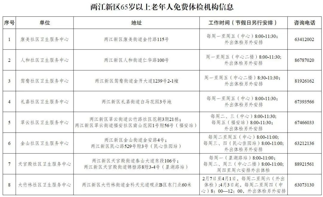 记者从两江新区社会发展局获悉,新区针对辖区65岁及以上常住居民、高血压、糖尿病患者等重点人群,每年开展一次不限户籍的免费体检。