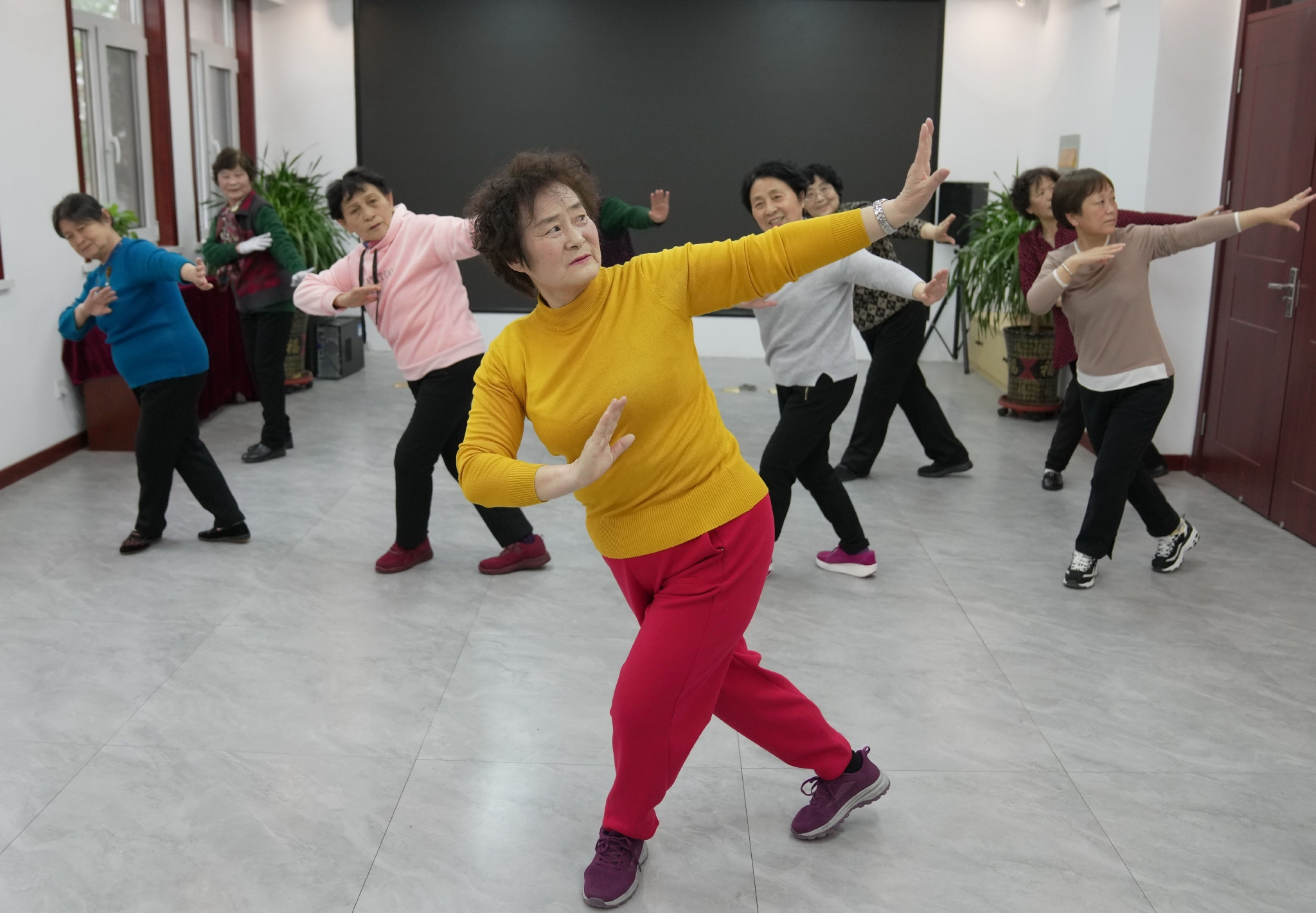 4月21日,老年人在秦皇岛市北戴河区安居社区日间照料服务中心排练“五一”联欢节目。新华社记者 杨世尧 摄