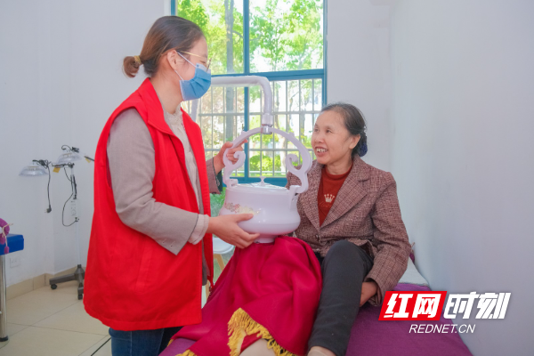 在湘郡社区居家养老服务站,社工为居民做艾灸。章帝 摄