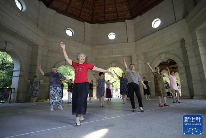 ↑7月25日,老年人在河北省唐山市路北区橡树湾社区养老服务中心练习跳舞。