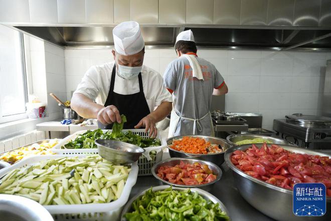 ↑7月25日,工作人员在河北省唐山市路北区煤研分院社区养老服务中心备餐。