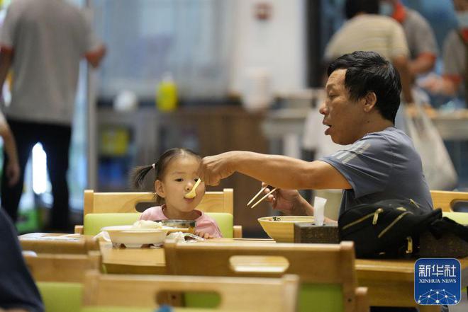 ↑7月25日,老人带着小孩在河北省唐山市路北区橡树湾社区养老服务中心就餐。