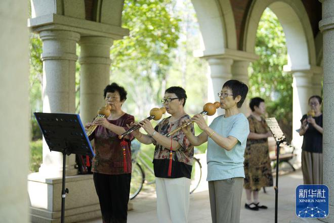 ↑7月25日,老年人在河北省唐山市路北区橡树湾社区养老服务中心练习吹奏乐器。