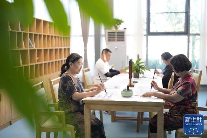 ↑7月25日,老年人在河北省唐山市路北区橡树湾社区养老服务中心练习书法。