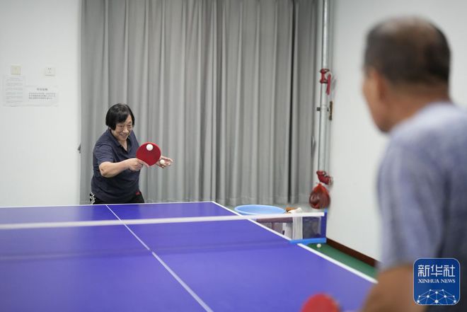 ↑7月25日,老年人在河北省唐山市路北区煤研分院社区养老服务中心打乒乓球。