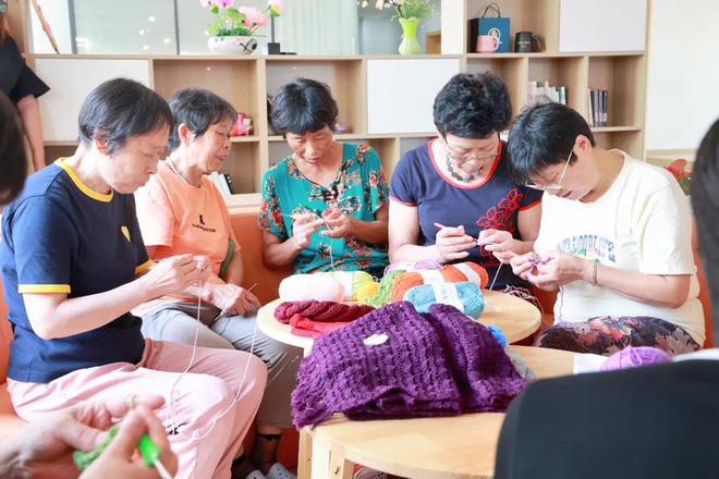 上午9时,华悦社区日间照料中心热闹非凡。二楼传来一片欢声笑语,阿姨们围坐成一圈,正在进行“巧手织万物”老年钩织手工活动,钩针在她们的手中自由翻飞,毛线球在桌上肆意滚动。