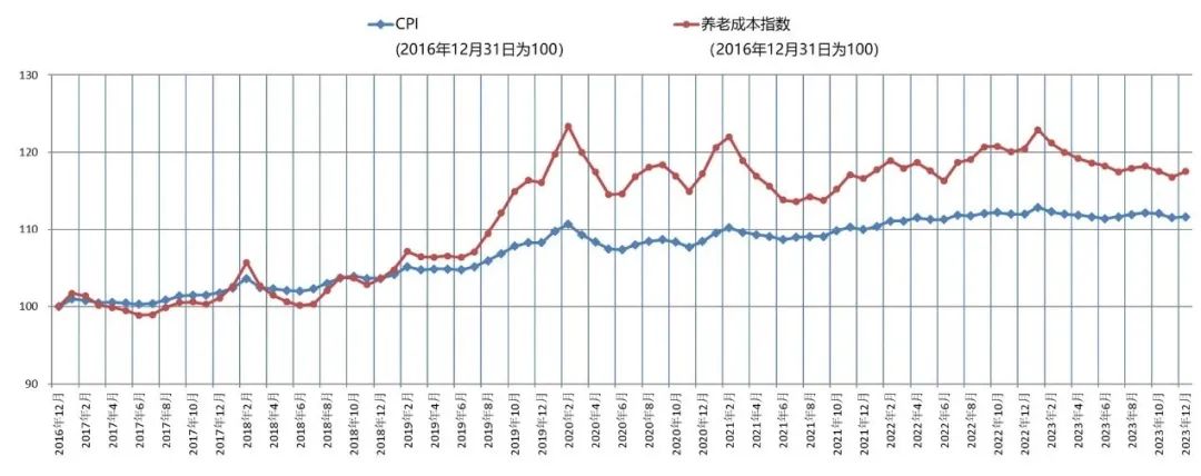 图为2016年底至2023年12月CPI及养老成本指数走势图