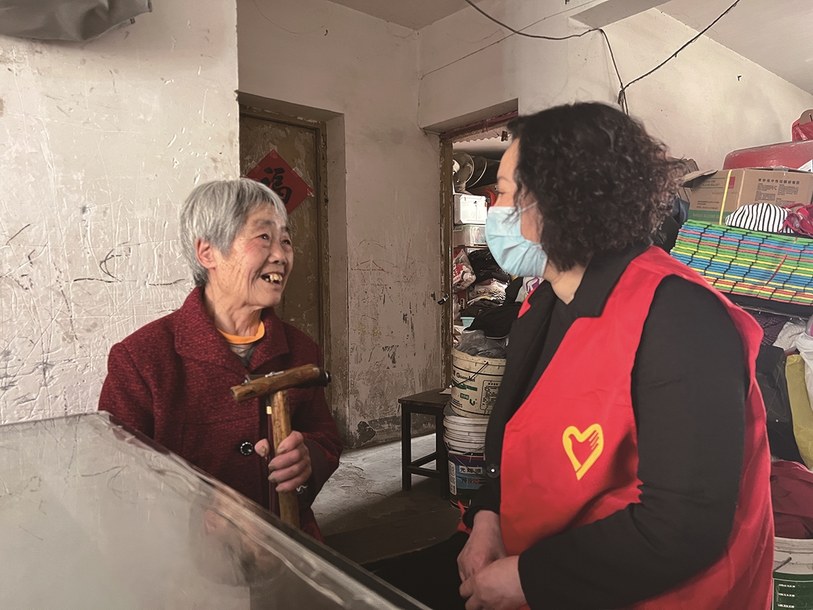 身为抗疫志愿者的陈荷玉(右)常上门看望郭文成老人